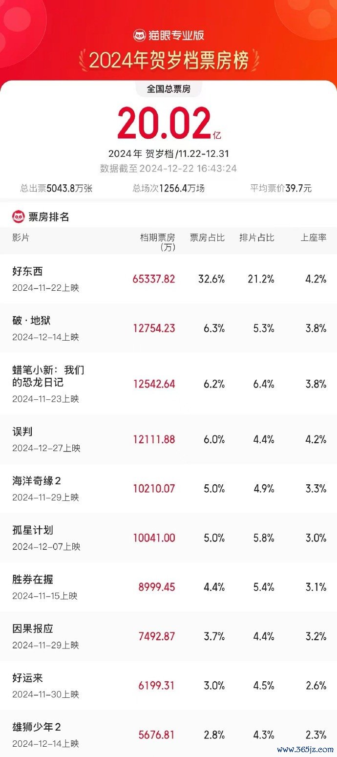[2024贺岁档总票房破20亿]据猫眼专科版数据,终端12月22日16时43分开云体育,2024年贺岁档(11月22日-12月31日)总票房(含预售)破20亿,《好东西》《破·地狱》《蜡笔小新:咱们的恐龙日志》分列2024年贺岁档票房榜前三位。(中新经纬APP)