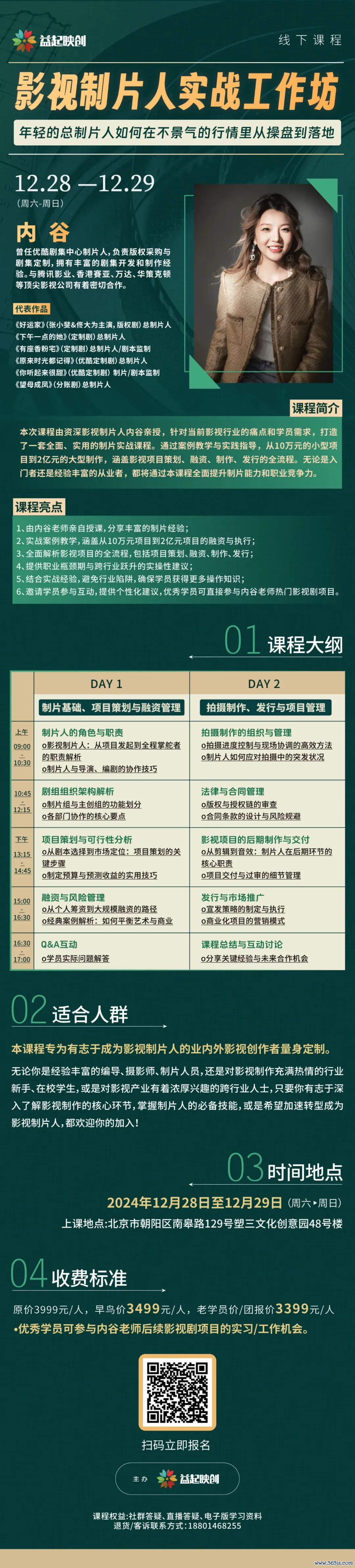 课程当中,内谷老诚会具体带你拆解更多她切身操盘和参与的技俩,固然课程只须两天,但囊括了老诚过往十几年教养索取,内容制片表面、设施、教养,也都涵盖进去:
