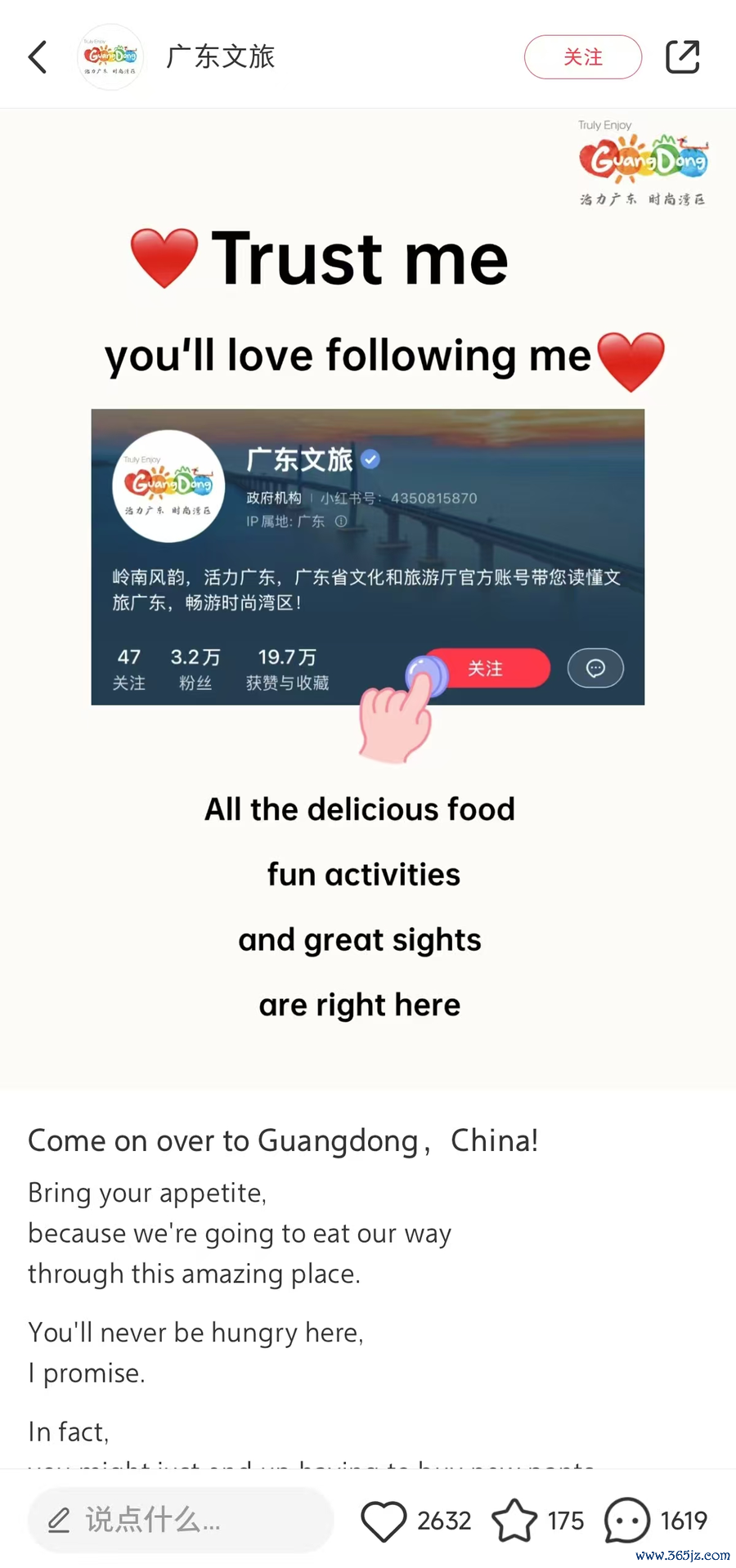 广东文旅发布了一条条记,写说念:“确信我,你会爱上关注我的。”