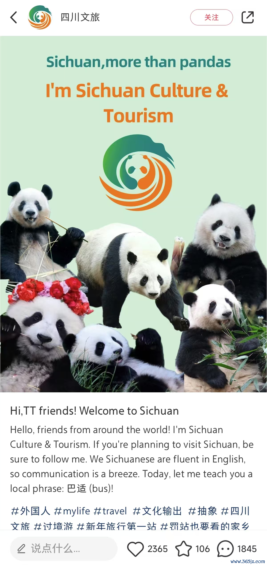 四川文旅拿出了东说念目的东说念主爱的大熊猫蛊惑番邦网友,并暗意,四川东说念主的英文都十分流利,是以相似起来不费吹灰之力,还教了番邦网友一个腹地词汇:巴适(bus)。