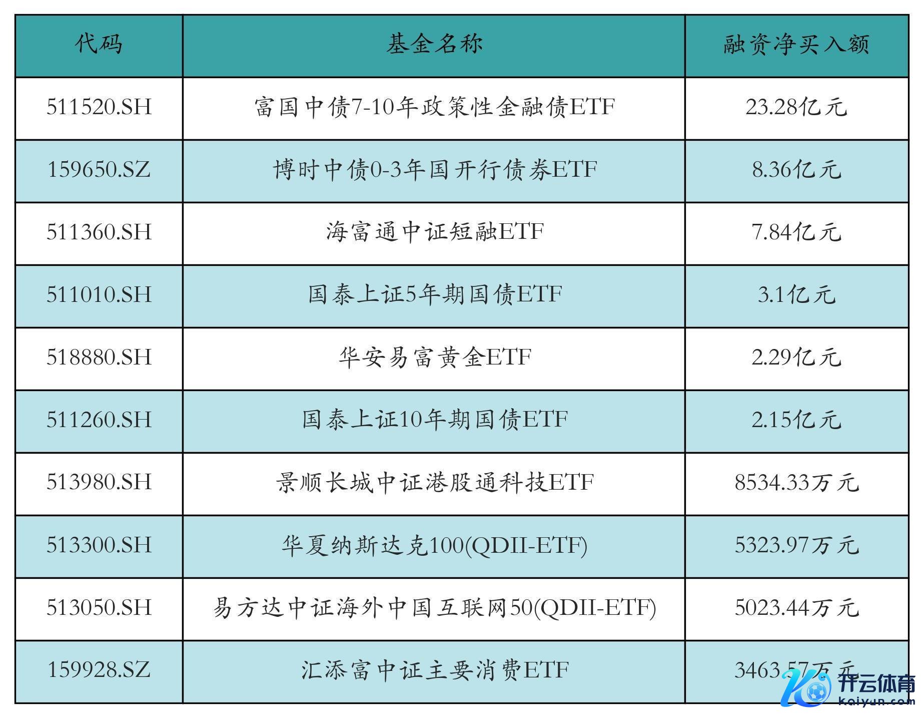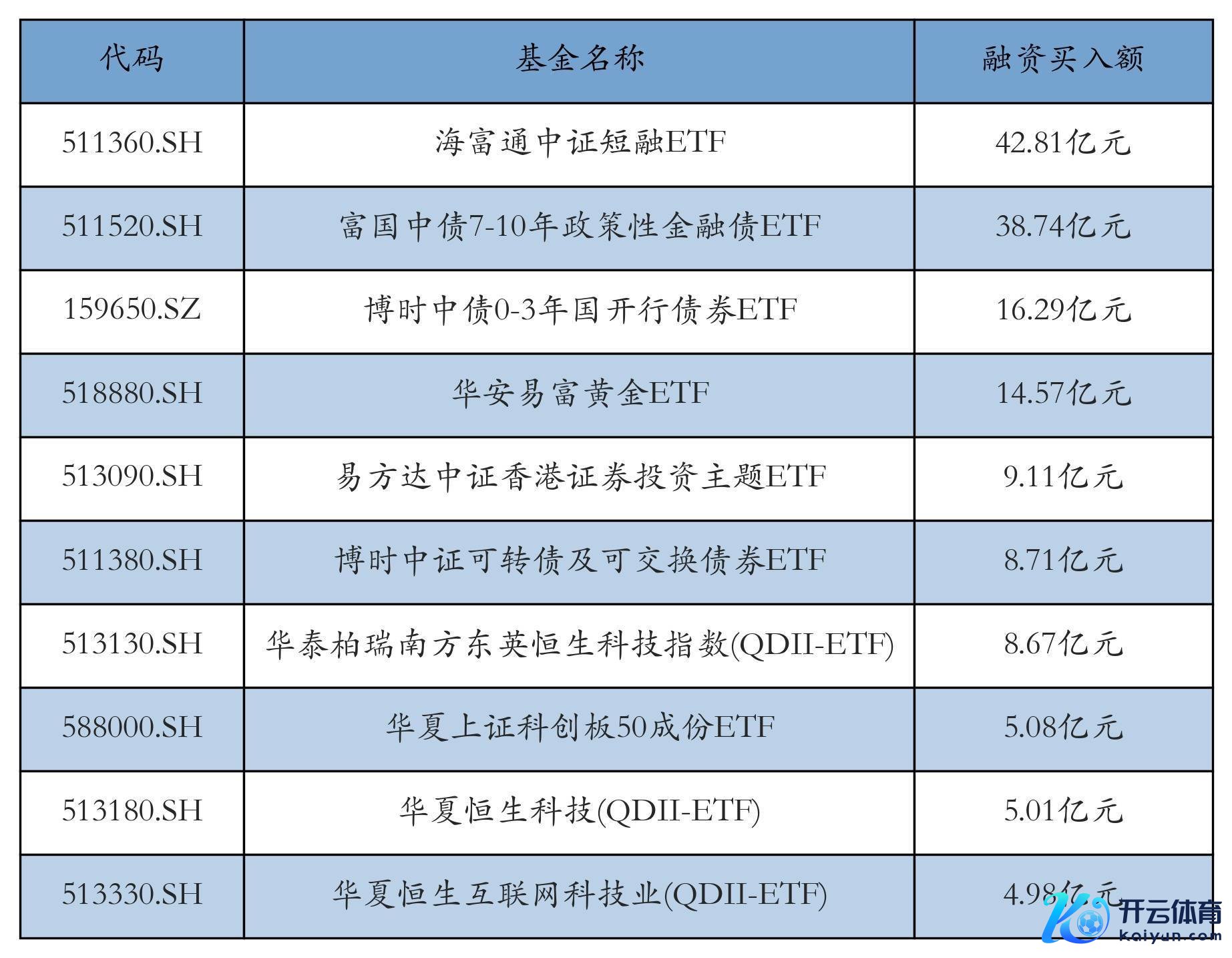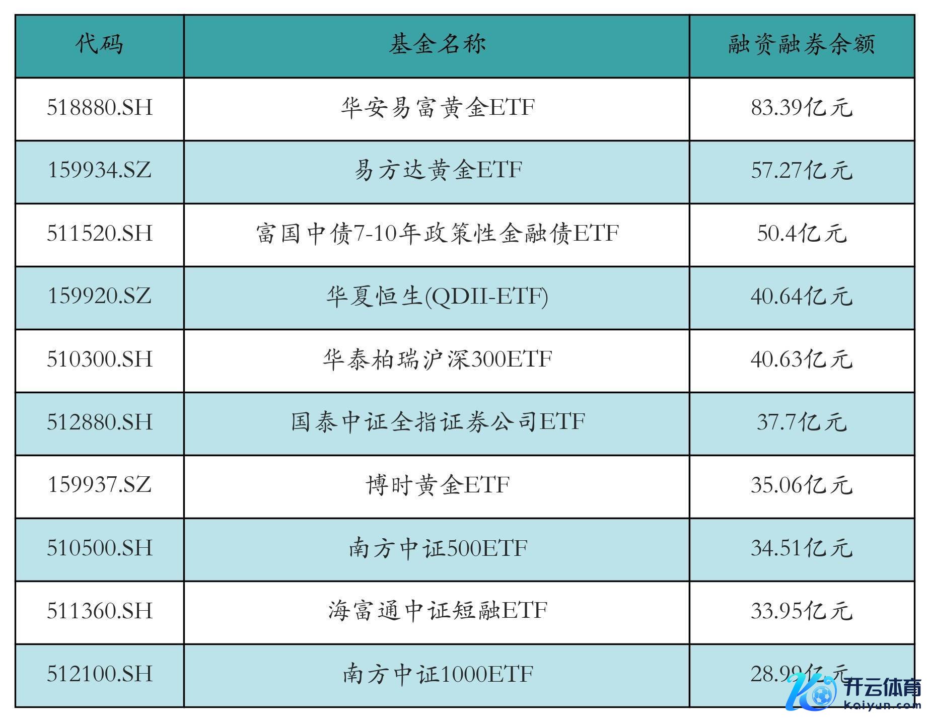 11月11日ETF两融余额前三位分辨为:华安易富黄金ETF(83.39亿元)、易方达黄金ETF(57.27亿元)和富国中债7-10年战略性金融债ETF(50.4亿元),前10具体见下表:
