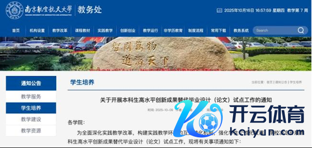 快科技10月17日音讯,据媒体报说念开云体育(中国)官方网站,近日南京航空航天大学印发《对于开展本科生高水平改造效果替代毕业遐想(论文)试点责任的见知》,明确自2026届起,本科生可凭借高水平竞赛获奖、改造实践名堂结题、学术论文发表、发明专利授权四类效果,央求替代传统的毕业遐想(论文)。该策略仍是发布,飞速激励庸俗眷注。